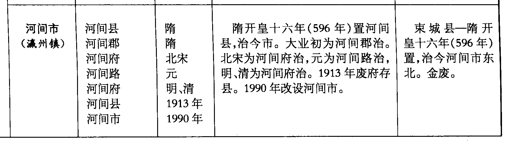 河间市(瀛州镇)河间县河间郡河间府河间路河间府河间县河间市隋隋北宋元明、清1913年1990年隋开皇十六年(596年)置河间县,治今市。大业初为河间郡治。北宋为河间府治,元为河间路治,明、清为河间府治。1913年废府存县。1990年改设河间市。束城县—隋开皇十六年(596年)置,治今河间市东北。金废。