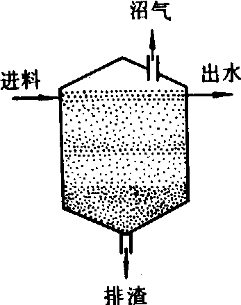 图1 常规消化器示意 全混消化工艺 在消化器中设有搅拌装置使发酵料液处于完全混合状态,改变了常规消化工艺料液分层现象,使微生物的活动区遍布整个消化器,因而其消化速度比常规消化工艺有明显提高(图2)。采用该工艺常在恒温下连续投料运转,进入消化器的高浓度原料,很快与消化器内全部发酵液混合,原料被稀释,经消化后排出的料液浓度,与消化器内参与反应的料液浓度相等,因而出料过程中,发酵微生物也随之排出,增加了出料浓度,减少了消化器内微生物的数量。为了维持消化能力,微生物的排出速度不得高于微生物生长速度,即发酵原料的滞留期不能低于活性污泥的倍增时间。因此要定出合理的滞留期,并加大进料浓度。一般进料COD(化学需氧量)浓度不应小于5000毫克/升,也就是说,该工艺不适宜低浓度有机污水的处理,而适用于处理高浓度有机污水及高悬浮固体含量的有机废物,如禽畜粪便等的厌氧消化。高速消化工艺在中温情况下一般负荷为COD 2~3千克/立方米·天,高温情况下为COD 5~6千克/立方米·天。
