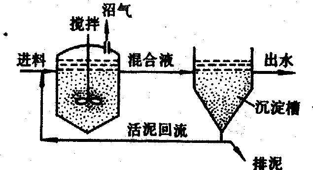 图2全混消化器示意 厌氧接触工艺 在全混消化器的出料处增设一个沉淀槽,用以收集排料中的活性污泥,并将其回流主发酵器内(图3)。该工艺的特点是由于活性污泥的回流既延长了固体的滞留期,又可提高发酵器内活性污泥的浓度,同时还减少了出料中的固体物含量,从而提高了有机负荷和处理效率。由于有了较长的活性污泥滞留期,所以适用于浓度较低的有机废水处理。一般为COD 2000毫克/每升以上。当进料浓度较高时,发酵器也可承受较高负荷。