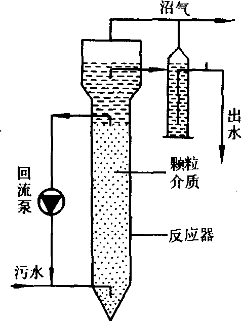 图6 上流式厌氧污泥床 在上流式厌氧污泥床内,颗粒污泥的形成和增多对提高消化器负荷及运转稳定性均有明显作用。采用经厌氧消化后的猪粪、牛粪、污泥等残余料做接种物,均可在运转过程中形成颗粒污泥。据观察,起动运转50天后,颗粒污泥即开始形成,但颗粒直径较小,一般为400~700微米。运转100~200天后,大多数颗粒污泥的直径在1~2毫米之间,最大可达6毫米。形成颗粒污泥的条件是: ❶应供给细菌生长所需要的足够营养物质。 ❷去除进料中非絮凝性或絮凝性差的悬浮固体; ❸创造有利于加速颗粒絮凝的条件,如保持一定量的钙离子浓度等。上流式厌氧污泥床与厌氧滤器,都是微生物滞留型厌氧消化工艺装置,温度和底物浓度的变化对底物消化速度的影响,不像完全混合式细菌呈分散状态影响那样大。生物膜和颗粒污泥,对温度及底物浓度的变化有较强的缓冲能力,因而使该工艺具有更大的稳定性。 膨胀床和流动床厌氧消化工艺 两者同属于附着生长型生物膜消化技术,20世纪70年代中期,美国学者朱厄尔(W.J.Jewell)等人将它们各用于污水处理。这一工艺是在消化器内填有一层像沙粒一样大小的惰性介质, 一般为焦炭、硅藻土、粉煤灰或合成材料等物料,介质颗粒直径约为0.2毫米左右。有机污水在介质空隙中自下而上穿流而过,污水上升的速度加上所产气体上升速度,足以使介质呈膨胀状态或流态化。每个介质颗粒都被生物膜所覆盖,这样使每单位体积消化器可以比悬浮生长或厌氧滤器工艺具有更大的有效表面积,能够支持更多的生物量,从而提高厌氧生物降解能力。为使消化器内的颗粒膨胀呈流态化,反应器需装循环泵提高消化液的上流速度(图7)。消化器中的载体颗粒在流体不流动时,颗粒相互接触形成“固体床”。当流体的流速很小时,流体从固定床的缝隙中穿过而床层静止不动。当流体流速加大,床层下部压力随流体速度的加快而增大。在此压力相等于单位面积床层上载体的重量时,固体颗粒的位置开始松动,空隙增加,但颗粒之间依然保持接触,床层略有膨胀, 一般为10%~20%,这时的床位便谓之膨胀床。随着流体流速的进一步加快,压力超过载体的重量,载体便完全呈悬浮状态,彼此分离并可往各个方面自由运动,即称之为流化床。流化床的体积的膨胀为30%~50%,甚至可超过100%。