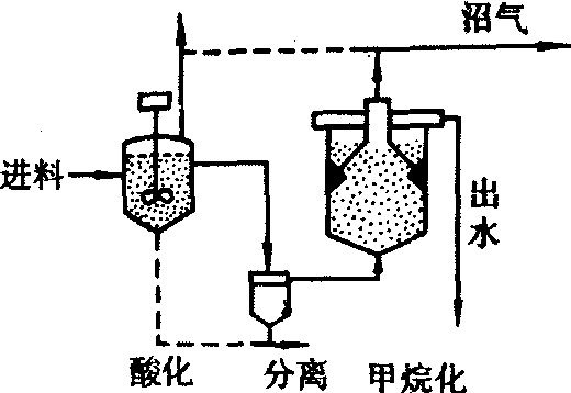 图7 膨胀床和流化床工艺装置 两阶段厌氧消化工艺 这是按沼气发酵过程中水解酸化阶段和甲烷化阶段,分别于两个发酵器内进行的一种工艺。在物料产沼气的过程中,存在着水解酸化及甲烷两个阶段,这两个阶段分别由水解发酵菌群和产甲烷菌群所完成,并且两个菌群无论在营养要求、生理代谢、繁殖速度和最适环境条件等方面都有较大差异,把两个阶段分开进行将能提高厌氧消化的效率。近30年来,美国的高斯(G.Ghosh)等人一直在进行这方面的研究,并建立了若干生产装置。他所采用的处理果酒废水的两个阶段厌氧消化装置(图8),由于水解酸化菌群繁殖较快,所以酸化发酵器体积较小,采用高速消化器适用于处理含有大量水果渣的污水。由于产甲烷菌繁殖速度较慢,甲烷化发酵器体积较大。进料为可溶性有机酸溶液,所以甲烷化发酵器采用了上流式厌氧污泥床。两阶段厌氧消化的运转数据列于下表。 果酒废水中温(35℃)两阶段处理运转数据
