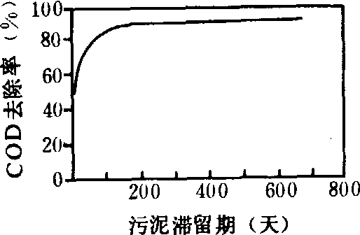 图3 厌氧接触工艺 厌氧滤器消化工艺 是一种采用截面菌种过滤技术的装置(图4),消化器内填充有惰性介质,通常采用颗粒直径为25~38毫米的碎石、卵石、焦炭、煤渣、各种形状的塑料制品、陶土制品或软性纤维填料。微生物尤其是产甲烷菌,呈膜状附着于惰性介质的表面,并在介质颗粒之间的空隙里互相粘附成颗粒状或絮状物存留下来。当有机污水向上流动通过生物膜时,微生物获得营养物质和能量而生长,有机物被细菌消化而去除。滤器中填料的空隙率约占总体积的40%,随微生物生长、生物膜增厚,会导致滤器堵塞。这是该工艺存在的主要问题。污水中COD的去除率不仅与水力滞留期(HRT)有关,而且在很大程度上取决于污泥滞留期(SRT)。根据美国科学家麦卡蒂(P. L. Mecarty)等的实验结果(图5),在一定时间范围内,在HRT不变的情况下,COD的去除率与SRT呈正相关。许多实验表明,在保持同样去除率的情况下,提高SRT可以大大缩短HRT,从而缩小消化器的体积。这种将SRT与HRT分开,使发酵器内积累尽可能多的活性污泥的做法,推动了厌氧消化技术的发展。
