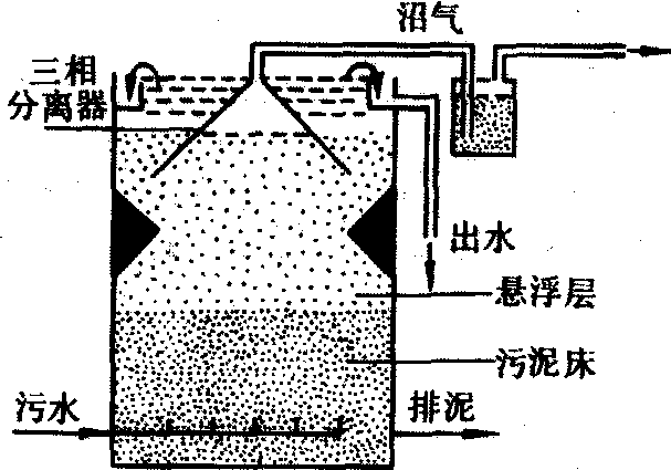 图5 COD去除率与污泥滞留期的关系曲线 上流式污泥床厌氧消化工艺 简称UASB,是荷兰兰庭格(G. Let-tinga) 于1977年研究成功的一种厌氧消化工艺。该工艺装置结构比较简单(图6),效率高,运转费用较低。消化器底部由浓度很高,并且具有良好沉降性能的絮状或颗粒状活性污泥形成污泥床。有机污水从反应器的下部进入污泥床并与活性污泥接触。污泥中的微生物分解有机物生成沼气,由于气泡上升的搅动作用,使发酵器上部的污泥处于悬浮状态,形成逐步稀薄的污泥悬浮层。消化器顶部安装有气、液、固三相分离器。在分离器下,首先将沼气收集经管道输走,固体与液体进入沉淀区,污水中的污泥发生絮凝,颗粒逐步增大,在重力作用下沉降。分离器的倾角,各为50°左右, 沉淀在斜壁上的污泥, 沿着斜壁滑回发酵器内,使发酵器内积累起大量活性污泥,分离出的废水从上部溢流排出。此类发酵器的高度一般为3~6.5米。