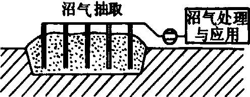 图10 半塑式沼气池示意 填埋厌氧消化工艺 利用自然沟壑大规模埋放城市有机垃圾并从中抽取沼气的一种厌氧处理工艺,填埋技术无论是从环境或是能源两方面来看,对今天的社会都具有非常重要的意义。方法是对填埋场地基进行处理,多采用铺设粘土,以防止渗出液渗入地下,将填埋场表面用粘土覆盖并种植花卉,以防止气味扩散。在填埋场垃圾内埋设带有滤孔的管道,用泵将沼气抽出,经净化处理后送给工厂或并入天然气管网,便能防止所产沼气四处横溢引起的爆炸(图11)。为了加速沼气的生成,在堆积垃圾时加入5%的清化污泥接种物和营养物质。加入污泥的填埋后第二年产气最多。三年累计产气量为0.095立方米/千克干物质,甲烷产量为0.051立方米/千克干物质。
