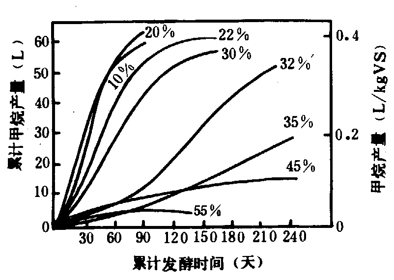 图8 两阶段沼气发酵工艺 干发酵工艺 以固体有机废物为原料,在少水条件下进行厌氧消化的一种工艺。1980年康奈尔大学根据美国能源部的要求首先进行了干发酵研究,用来处理农业废弃物或城市挥发性固体有机物。干发酵的干物质含量在20%左右较为适宜,干物质含量超过30%则产气量明显下降(图9)。由于干发酵时水分少,所生成的挥发酸得不到稀释,挥发酸的积累常引起pH值的严重下降,导致发酵原料酸化,沼气发酵停止。为了克服pH值的下降,常用方法有:❶加大接种物用量,使酸化和甲烷化速度能尽快达到平衡,一般接种物用量应为原料的30%; ❷增加高含氮原料用量,如人畜粪便等,以降低C:N比值,使原料在分解时所产生的挥发酸能被其所产生的氮中和; ❸将原料进行堆沤,使易于产酸的有机物质被氧化分解掉一部分。由于堆沤会造成料的浪费,所以在生产上应首先考虑采用前两种措施,中国山东省能源研究所的应用研究表明,采用批量投料发酵进行120天后,纤维素降解了53.5%,脂肪降解了45.9%,总碳消耗为34.68%,平均每千克干物质产气量为216.7升;在平均温度为26.7℃条件下,产气率平均为0.298立方米/立方米·天。干发酵要求便于进出原料,半塑式沼气池适用于干发酵工艺(图10)。