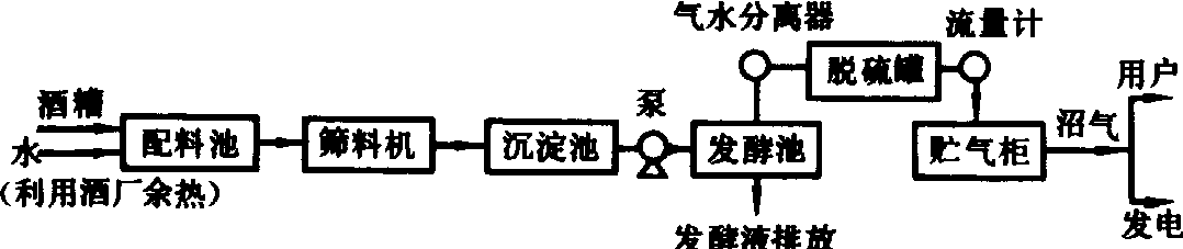 图11填埋示意图 沼气发酵工艺都是为了满足不同原料在较短时间内使用机质得以更快地降解。产甲烷菌的生长和繁殖速度以及较快地从物料取得营养物和能量是完成上述要求的关键。工艺的选择决定于物料和具体条件。除上述工艺外,还有生物转盘工艺,折流沉淀工艺,以及连续发酵塞流工艺等。 为了提高消化率和去除率,各类工艺可相互串联使用,如上流式污泥床和滤器相结合,厌氧发酵和好氧发酵相结合等。可采用单级发酵工艺或两级和多级发酵工艺。后者有机物滞留期长,分解较彻底,但投资较高。 沼气发酵过程中,有机物的分解和产气温度有密切关系,温度高时,微生物活跃,分解消化快,产气高。因此通常也以不同发酵温度区分为高温发酵(50~60℃),中温发酵(30~35℃)和常温(环境温度)发酵工艺。 不同原料由投入经发酵至最后排出沼渣的整个过程中所采用的不同技术和方法的措施,组成了某一特定的流程,称之为工艺流程,通常以框图表示。此流程图表示了应采用的各类设备,是设计沼气工程的技术依据,也是经济评价的根据。下面是一个酒厂处理酒糟的工艺流程图: