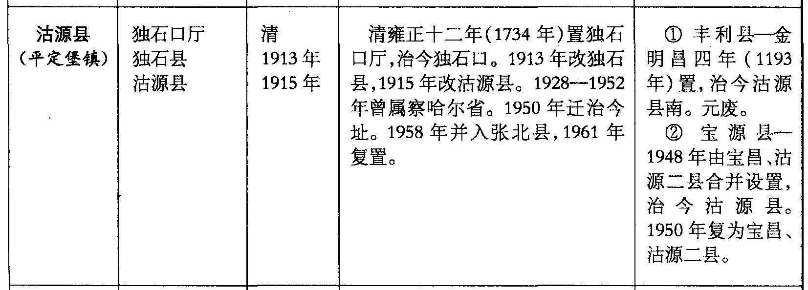 沽源县(平定堡镇)独石口厅独石县沽源县清1913年1915年清雍正十二年(1734年)置独石口厅,治今独石口。1913年改独石县,1915年改沽源县。1928—1952年曾属察哈尔省。1950年迁治今址。1958年并入张北县,1961年复置。❶ 丰利县—金明昌四年(1193年)置,治今沽源县南。元废。❷ 宝源县—1948年由宝昌、沽源二县合并设置,治 今 沽 源 县。1950年复为宝昌、沽源二县。