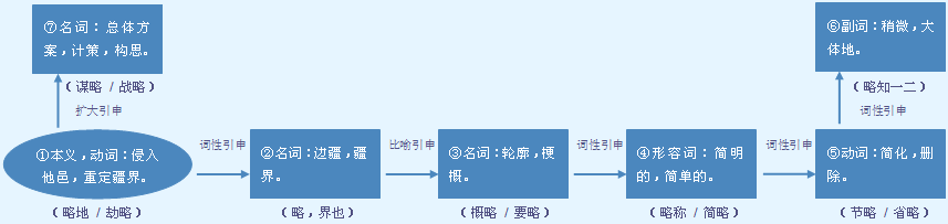 | 释义 | 略 1 (*畧)★★★ 00890名![]() (*畧) (*畧) 简单;略微: 粗~|~图|~知一二|~有所闻。 详 xiáng ~情|不厌其~|语焉不~|写文章要~略得当。 繁 fán ~杂|删~就简。 ★ “略”也表示简单扼要的叙述,如说“史略”、“事略”、“要略”;还表示省去、简化,如说“从略”、“中间的话都略去了”。 字源解说 “各”是“略”的本字。当“各”的“进犯”本义消失后,金文 附 文言版《説文解字》:略,經略土地也。从田,各聲。 附 白话版《说文解字》:略,管理侵占的土地。字形采用“田”作边旁,采用“各”作声旁。 引申线索 ![]() 【字族索引】 各 【同音字】 lüè |