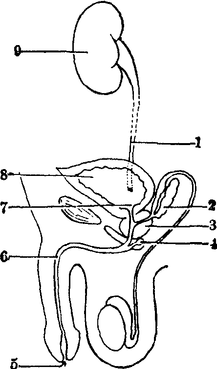 1.输尿管 2.精囊腺 3.前列腺 4.尿道球腺 5.尿道外口 6.尿道 7.尿道内口 8.膀胱 9.肾
