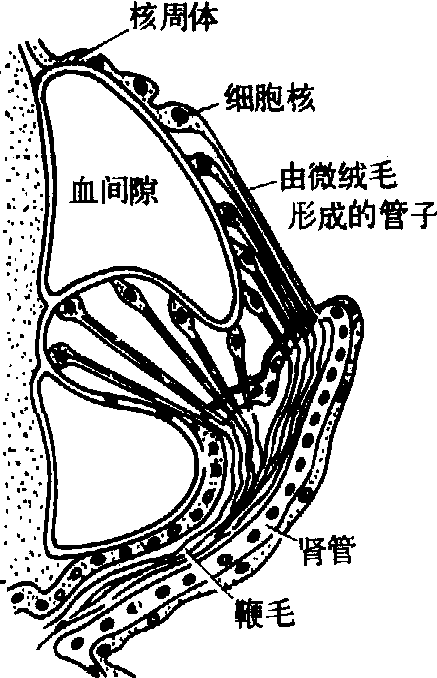 脊索动物的泌尿系统 文昌鱼的排泄器官似原肾管(图1),有90~100对,位于咽壁的背外侧,开口于围鳃腔。肾管分支的末端具有许多焰细胞,分出一些突起的分支,贴附在血腔表面。这些突起称为足突,与相邻的细胞足突交错相嵌。焰细胞一端分出10根左右长的细胞质小杆,围成管状,开口于肾管; 小管内有一根鞭毛。这种焰细胞又称筐足细胞。 脊椎动物的泌尿系统有肾、输尿管、膀胱和尿道等器官。 肾和输尿管 肾是主要的泌尿器官。其构造和功能基础叫肾单位,包括肾小体和肾小管两部分。前者起超滤过作用,后者有重吸收和分泌功能,依据发生,肾可分为原肾、前肾、次肾、中肾和后肾(图2),次肾有时也列为中肾,或称后位中肾。