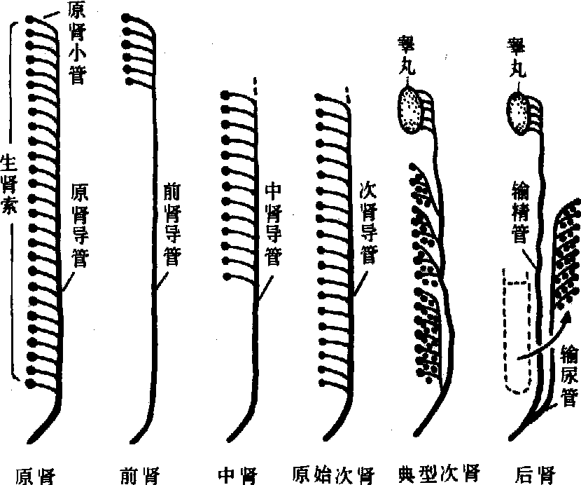 图 2 肾的发生类型图解 原肾 为原始类型的肾,由中胚层所有体节的生肾组织 (生肾节或生肾索) 发育形成,因此又称全肾。原肾包括一系列成对的原肾小管,汇集于一对原肾导管。原肾小管每体节有一条,一端以围有纤毛的肾口开口于体腔,邻近有主动脉分支形成的外血管球,滤出液经体腔而间接入原肾小管; 或由体腔的一部分凹陷形成双层杯状的肾小囊,与肾小管连通,血管球则包于囊内而成为内血管球,滤出液可直接入原肾小管。原肾小管的另一端接原肾导管,后者又称沃尔夫(Wolff)氏管,是原肾的一对输尿管道,沿体腔全长延伸,开口于泄殖腔。原肾仅见于七鳃鳗和蚓螈的幼体。脊椎动物其他类型的肾,都是由原肾从前向后发育形成,个体发生也重演这一过程。 前肾 是原肾最前和最早出现的部分,由1~12对生肾节发育而成。前肾小管的构造与原肾小管相似,有时血管球可合并为一个大血管球。前肾导管是原肾导管的继续。前肾见于脊椎动物的胚胎时期,仅在无羊膜动物(鱼类和两栖类)的幼体具有功能,在羊膜动物(爬行类、鸟类和哺乳类)存在时间很短,并且不具功能。少数低等脊椎动物,如七鳃鳗和某些硬骨鱼,前肾也存在于成体,称为头肾。两栖类和许多鱼类的前肾在退化后衍变为淋巴组织或腺组织。 次肾 无羊膜动物成体的肾。是在胚胎发生稍晚时期由前肾之后的所有或大部分生肾组织发育而成。其前部起初仍具分节性,但向后由于肾小管次生性地分支多次,同时肾小管延长而盘曲,于是分节性丧失,遂成为膨出于体腔内的器官。肾小管的肾口可见于发育早期,有些甚至可永远保留(如某些鲨类、原始硬骨鱼类和两栖类),但通常全部消失。肾小囊与内血管球构成肾小体,与延续的肾小管一起形成典型的肾单位。肾小管一端与向后生长的前肾导管相接,后者即构成次肾导管。有些软骨鱼和有尾两栖类,次肾的前部在雄性因与睾丸相联系而成为其输出管道,部分或完全丧失泌尿功能; 在雌性则萎缩。这些动物次肾的后部较发达,在有些两栖类的雄性,最后一些集合管可直接或汇合为副尿管,开口于泄殖腔。 中肾 由中部的生肾组织发育而成。每一生肾节形成若干肾单位; 肾小管与体腔的联系大部或全部消失。中肾见于羊膜动物的胚胎时期; 有些动物 (爬行类,单孔类、有袋类和某些有蹄类)可延续到孵化或出生后的短时间内。有胎盘类的中肾,其发达程度不一,在某些啮齿类较小,食肉类和灵长类中等,一些有蹄类则很发达,与不同动物胎盘的排泄功能大小呈相反关系。中肾导管是前肾导管的继续,但后来在雄性演变为附睾和输精管,在雌性则退化。 后肾 是羊膜动物成体的肾(见肾),在个体发生和系统发生上都是最晚形成的。后肾的泌尿部和排尿部由两个原基演发而成。泌尿部来源于生肾索的最后端,只相当于一、两个体节的生肾组织。大量肾单位是通过反复分支形成的,因此不呈分节性。肾口已全部消失。排尿部又称收集部,来源于中肾导管末段分出的输尿管芽。后者向后肾的泌尿部原基延伸,成为输尿管; 顶端又进行多次分叉,成为肾的集合管,与肾单位接通。在哺乳类,最初的一些分叉后来逐渐合并,形成肾盂和肾盏。 肾单位的类型 各类脊椎动物成体肾的肾单位,可分为三种主要类型。一类肾单位具有较大的肾小体,滤过液多,排出的水分也多。两栖类、淡水真骨鱼类和软骨鱼类属于此型。软骨鱼类为适应于海水中生活,一方面通过直肠腺排除大量盐分,同时肾小管能将尿素重吸收入血液,提高体液渗透压。另一类肾单位具有较小的肾小体,甚至缺如,有的肾小管远段也不存在,因此排出的水分少。海生真骨鱼类和爬行类属于此型。与此相适应,这些鱼类能通过鳃排泄含氮废物和盐分,而海生龟类则通过盐腺排泄过多的盐分并经膀胱壁重吸收水分。第三类的肾单位见于哺乳类,有大的肾小体,但在肾小管中部形成亨利氏襻,肾小体的滤出液在通过肾小管时大量水分被重吸收。鸟类的肾单位一部分与爬行类相似,一部分与哺乳类相似;海洋生活的鸟类有发达的盐腺,排出食入的过多盐分。此外,水分排出的多少还与肾单位排泄的含氮废物种类有关。一般脊椎动物的含氮废物为溶于水中的尿素,因此同时需要排出较多水分; 爬行类和鸟类的含氮废物为尿酸,几乎不溶于水,排出时只含很少水分。 膀胱 见于大多数脊椎动物(图3),是贮存尿液的器官,除哺乳类外还有吸收水分浓缩尿液和分泌的功能。缺少膀胱的脊椎动物有鱼类的圆口纲和板鳃纲,爬行类的蛇、鳄和某些蜥蜴,以及除驼鸟外的所有鸟类。鱼类的膀胱是次肾导管末段膨大或突出形成。两栖类和爬行类的膀胱则由泄殖腔的腹侧壁突出形成。龟和某些蜥蜴具有较大的膀胱; 有些淡水龟类还有两个副膀胱。两栖类和爬行类的尿液要通过泄殖腔才能进入膀胱。哺乳类在胚胎时期由原肠后端的腹侧壁突出形成尿囊(见胎膜),膀胱由胚胎体内的尿囊柄发育而成;输尿管直接开口于膀胱。