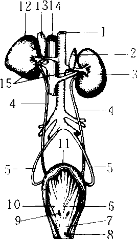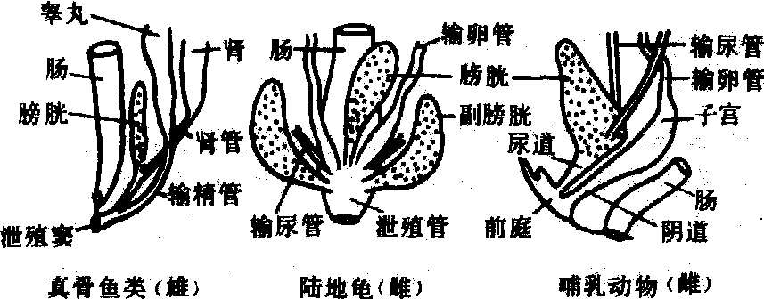图 3 脊椎动物膀胱的类型 尿道 见于哺乳动物,是将尿液从膀胱排出体外的管道。雌性哺乳动物的尿道较短,开口于阴道前庭。雄性哺乳动物的尿道较长,一部分位于阴茎内,开口于阳茎末端,因输精管也开口于尿道,所以兼有排精功能。 泌尿系统urinary system又称排泄系统。形成、输送、贮存和排出尿液的器官系统。哺乳动物的泌尿系统由肾、输尿管、膀胱和尿道组成。雌性和雄性的泌尿系统基本相似,但雄性的尿道(又称尿生殖道)比雌性尿道长。鸟类仅有肾和输尿管,无膀胱和尿道,输尿管直接开口于泄殖腔。