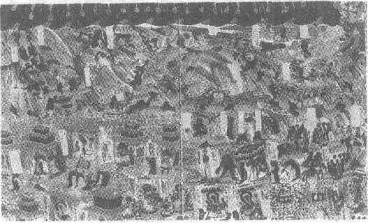 隋。纵55厘米,横390厘米。甘肃省敦煌县莫高窟第420窟窟顶东披壁画。《法华经》又称《妙法华经》、《妙法莲花经》共28品。佛经中称释迦成佛以来,寿命无限。现各种化身,“以种种方便,说微妙法,”以为一切众生,都能成佛。此为莫高窟艺术中早期《妙法莲花经变·观世音菩萨普门品》之一。佛经讲,人在遇到危难时,口诵观音名号,即可得免。画分三层,上层绘商人遇盗,将商人出发前的祈佛,道路遇灾难,直至观音的显现描绘得甚至比佛经所述的还要详尽。例如画面中有骆驼失足滚下山崖和途中行商为病驼灌药的场景。中层为观音菩萨“三十三身”。下层绘“观音菩萨救苦救难,有求必应”。其中有些场面相当感人。画面内容虽为佛教题材,但驼队的场景,不免使人联系到丝绸之路商侣的情景。
