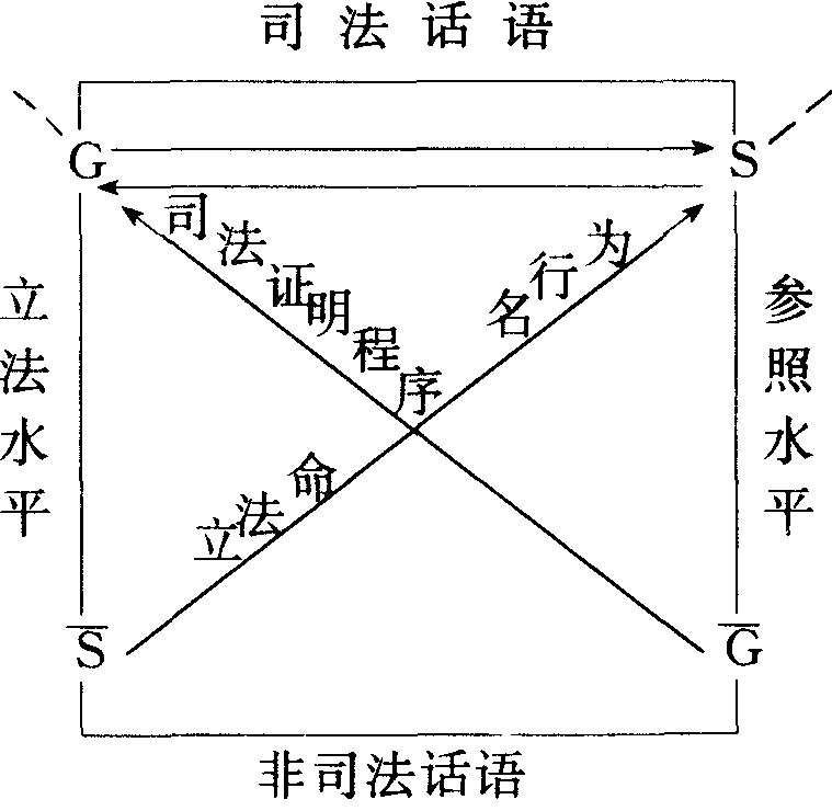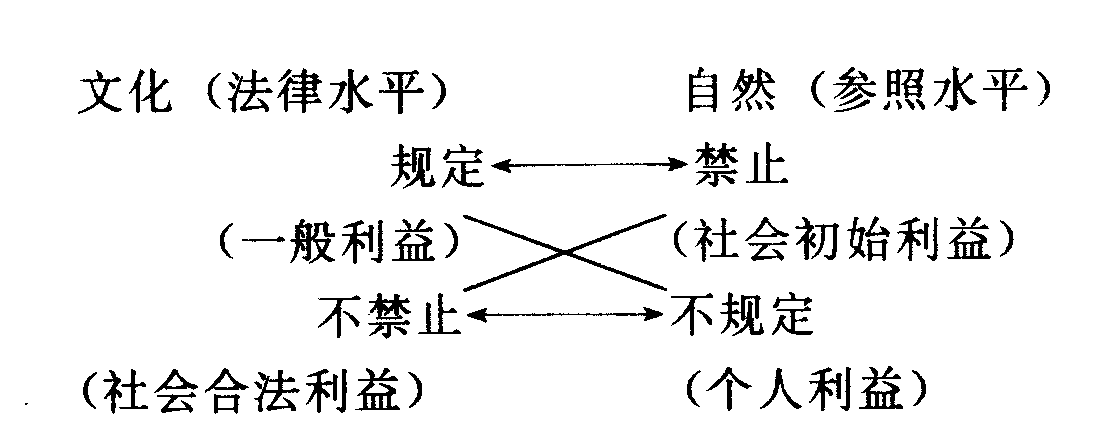 法律符号方阵法国学者A.J.格雷马斯(Greimas)设立的法律符号模型。格雷马斯利用逻辑学上的矛盾关系、否定关系、反对关系、蕴含关系等,设立法律的符号方阵。在非法律符号和法律符号的关系上,他设立了  这样的符号方阵:其具体含义和转换过程如下:“S”代表非法律性质的符号实体,通过立法者的命名行为,从左到右的对角线,它成为具有司法语义性质的法律符号实体,称为司法产品。法律符号客体处在法律的参照水平上(右上S),即由于它没有被证明和适用,不具有法律标有的语法属性,所以它只能转化成处于参照水平和非司法话语地位上(右上 )。通过司法证明程序(如法官运用法律过程,从右到左的对角线),其地位得到证实,变成具有法律意义的符号(右上G)。这是一个完整的由非法律符号客体变成法律符号的过程。格雷马斯有时称之为“法律语法”。在法律调整一定利益的问题上,格雷马斯设立了这样的法律符号方阵: 具体内容是:一个“生理的人”,当他还没有形成参与集体事业的愿望时,他是法律符号的旁观者。但是,他作为广泛国民的一部分,其合法利益在某种程度上受到国家的保护,从而从属于“一般利益”(左上)。当个人产生某种参与集体事业,有了新的财产愿望时,这种愿望由于没有适当的规定而具有自然性,称为“个人利益”(右下),它不受社会规划的限制。个人利益与其他的个人利益是冲突着的,由于他们都未从属于一定的社会控制,他们的各自活动往往被称为一种利益或权利的滥用,因而他们仍然是自然的,是禁止的对象(右上)。只有当他们避免权利滥用的行为时,立法者才承认这些社会的利益,并用规定和禁止体系加以调整,使之成为合法的社会利益和从属于文化性(左下)。自然的社会初始利益从属于禁止的领域,但当它们变成社会的合法利益时,这种禁止就被否定了,变成不禁止。这些被承认为社会的合法利益属于广大的不禁止行为的领域,代表着不被明文禁止的自由。但是,不禁止行为不意味着不受规则的调整。在立法水平上,通过立法者的立法行为,它通过规定的形式表现出来,成为法律的符号,为一般利益所掩盖(左上)。这是方法的最后一步操作。这是一个完整的对利益的规定和禁止的符号模型。围着方阵多重操作,从左上开始,也从那里结束。不规定是规定的否定(矛盾关系),禁止相对于规定反对关系)。 |
