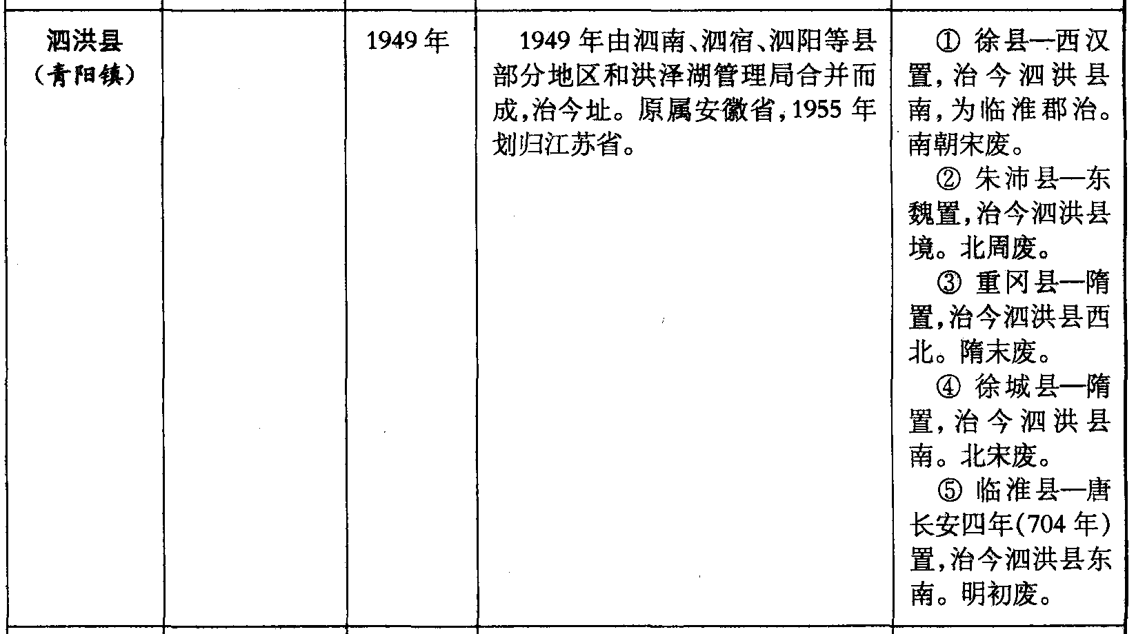 泗洪县(青阳镇)1949年1949年由泗南、泗宿、泗阳等县部分地区和洪泽湖管理局合并而成,治今址。原属安徽省,1955年划归江苏省。❶ 徐县—西汉置,治今泗洪县南,为临淮郡治。南朝宋废。❷ 朱沛县—东魏置,治今泗洪县境。北周废。❸ 重冈县—隋置,治今泗洪县西北。隋末废。❹ 徐城县—隋置,治今泗洪县南。北宋废。❺ 临淮县—唐长安四年(704年)置,治今泗洪县东南。明初废。