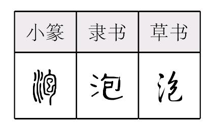 泡 金文; 篆pào[氵(水,意符)+包(聲符)→泡(《説文》:“泡,水。出山陽平樂,東北入泗。從水,包聲。”泡,氣體在液體内使液體鼓起來的球狀體〈泡沫,泡影〉。)] 杜鵬程《在和平的日子裏》:“再過一陣,雨點打得江水冒泡。” 泡(8画) ❶pāo ❷pào