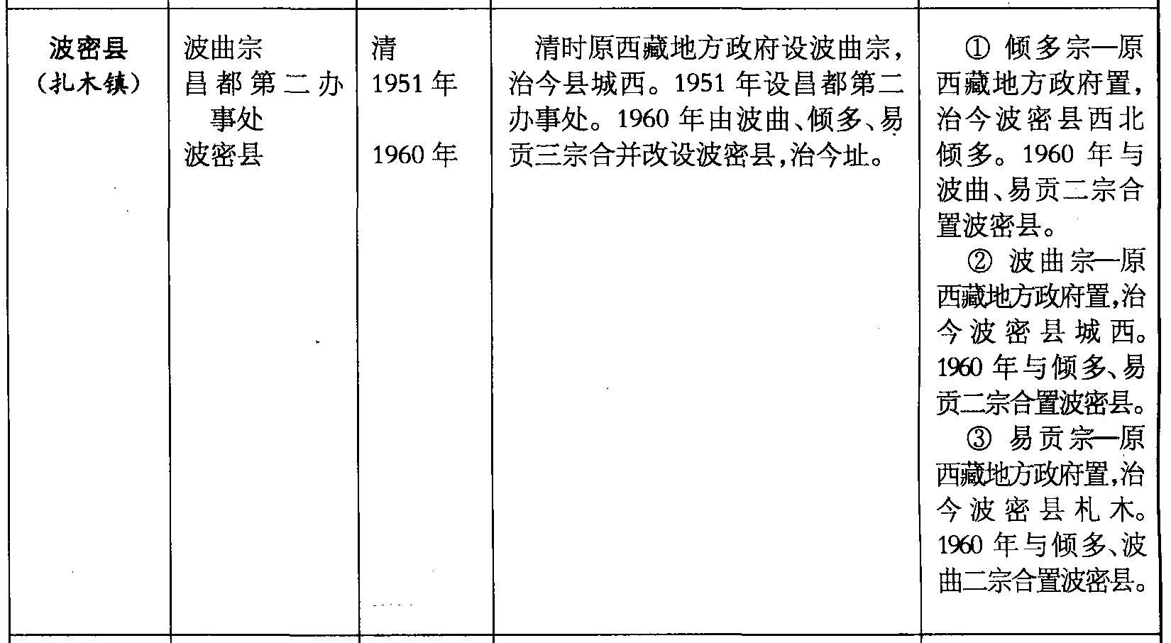 波密县(扎木镇)波曲宗昌都第二办事处波密县清1951年1960年清时原西藏地方政府设波曲宗,治今县城西。1951年设昌都第二办事处。1960年由波曲、倾多、易贡三宗合并改设波密县,治今址。❶ 倾多宗—原西藏地方政府置,治今波密县西北倾多。1960年与波曲、易贡二宗合置波密县。❷ 波曲宗—原西藏地方政府置,治今波密县城西。1960年与倾多、易贡二宗合置波密县。❸ 易贡宗—原西藏地方政府置,治今波密县札木。1960年与倾多、波曲二宗合置波密县。