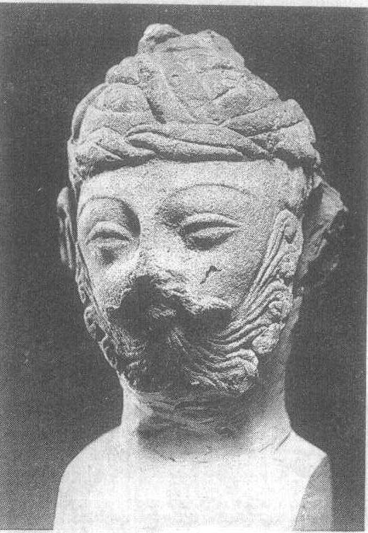 | 释义 | 泥塑男供养人头像 泥塑男供养人头像初唐。残高9厘米。1957年新疆焉耆锡克沁寺院遗址出土。新疆维吾尔自治区博物馆藏。此泥塑供养人像身躯部分已失,仅剩头部。头部带子缠绕,脸上络腮胡卷曲连鬓,眉弯而细,双目透出柔和的光芒,形象极其生动。从面貌可明显看出西域民族的相貌特征。汉唐时期地处西域的古国焉耆佛教十分兴盛,其中锡克沁寺院是佛教的中心之一,曾有不少佛教遗物出土,仅供养人头像就有不同年龄,不同性别的多种。