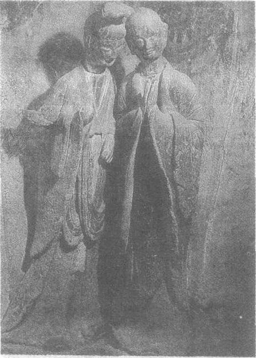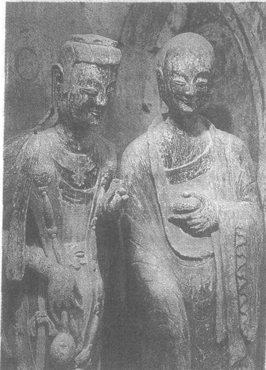 北魏。菩萨高115厘米,弟子高114厘米。甘肃省天水市麦积山石窟第122窟正壁右侧塑像。此为菩萨与弟子低声交谈的情景。菩萨面形瘦长,身材苗条,头戴一冠,胸佩宽项圈。内着僧祗支,披肩搭肩后交叉于腹前,腰系长裙。头微低,笑容可掬。右手提净瓶,左手捻花蕾。弟子面庞清秀,五官细致柔和。身披通肩袈裟,手持一钵,脸上的笑容透出柔顺和文雅。二人的身体不成直立状,上身与下肢形成一定的角度,其亭亭玉立之姿与俊美之貌十分吻合,给人以美感。菩萨身体装饰的繁复与弟子衣饰的简单形成合理的对比,对人物身份和性格的塑造起到了一定作用。