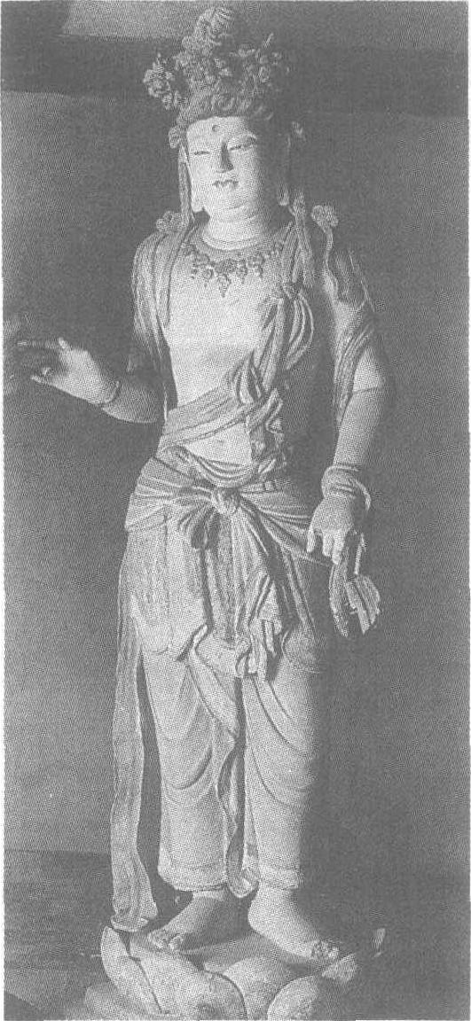 ☚ 石雕迦叶、阿难立像 彩塑天王立像 ☛ 泥塑菩萨像 泥塑菩萨像北凉。高135厘米。甘肃省张掖县金塔寺西窟中心柱东面下层龛外北侧塑像。头戴高宝冠,上身裸露,胸前缀满璎珞。质料具有轻薄之感的长裙系于腰间,裙紧贴双腿,显露出优美的曲线。肩披长巾自双肩绕下,迎风飞扬,飘逸潇洒。菩萨面形秀丽,五官灵巧,给人以纤柔之感。但其眉宇间又透出一股英气,外柔内刚,令人肃然起敬。