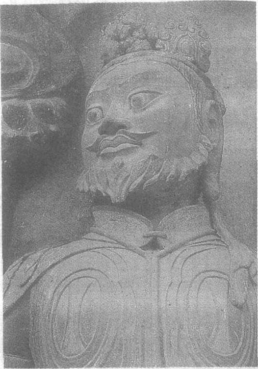| 释义 | 泥塑踏牛天王像 泥塑踏牛天王像初唐。天王高354厘米;卧牛高97厘米,长142厘米。甘肃省天水市麦积山石窟第5窟中龛前廊左侧塑像。此窟原有天王四身,现仅存这身“摩醯首罗天”。天王似一武将形象,头戴宝冠,剑眉高扬,双目怒睁,下颔的虬髯向外翘出。身穿长甲及护胸,双手紧握拳抬至腹前,双肢分开稳立于牛背之上。牛昂首而卧,其肌肤的塑造真实可爱。天王像在佛教造像题材中较为常见,但骑牛的形象极少。《无量寿经下·叹菩萨之德》曰:“犹如牛王,无能胜敌。”此尊骑牛天王即具顶天立地之气概,似为正义的护卫者。因这身天王像的存在,此窟又被人惯称为“牛儿堂”。