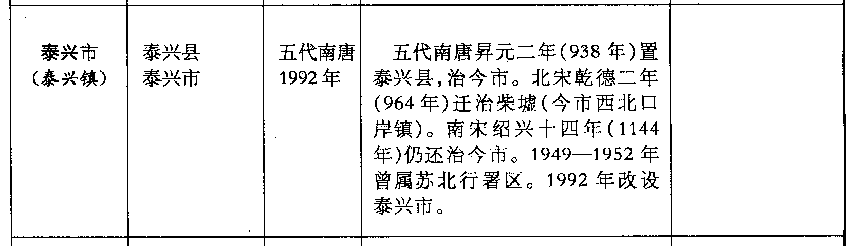 泰兴市(泰兴镇)泰兴县泰兴市五代南唐1992年五代南唐昇元二年(938年)置泰兴县,治今市。北宋乾德二年(964年)迁治柴墟(今市西北口岸镇)。南宋绍兴十四年(1144年)仍还治今市。1949—1952年曾属苏北行署区。1992年改设泰兴市。
