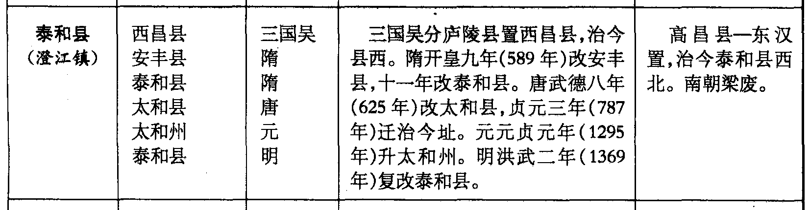 泰和县(澄江镇)西昌县安丰县泰和县太和县太和州泰和县三国吴隋隋唐元明三国吴分庐陵县置西昌县,治今县西。隋开皇九年(589年)改安丰县,十一年改泰和县。唐武德八年(625年)改太和县,贞元三年(787年)迁治今址。元元贞元年(1295年)升太和州。明洪武二年(1369年)复改泰和县。高昌县—东汉置,治今泰和县西北。南朝梁废。