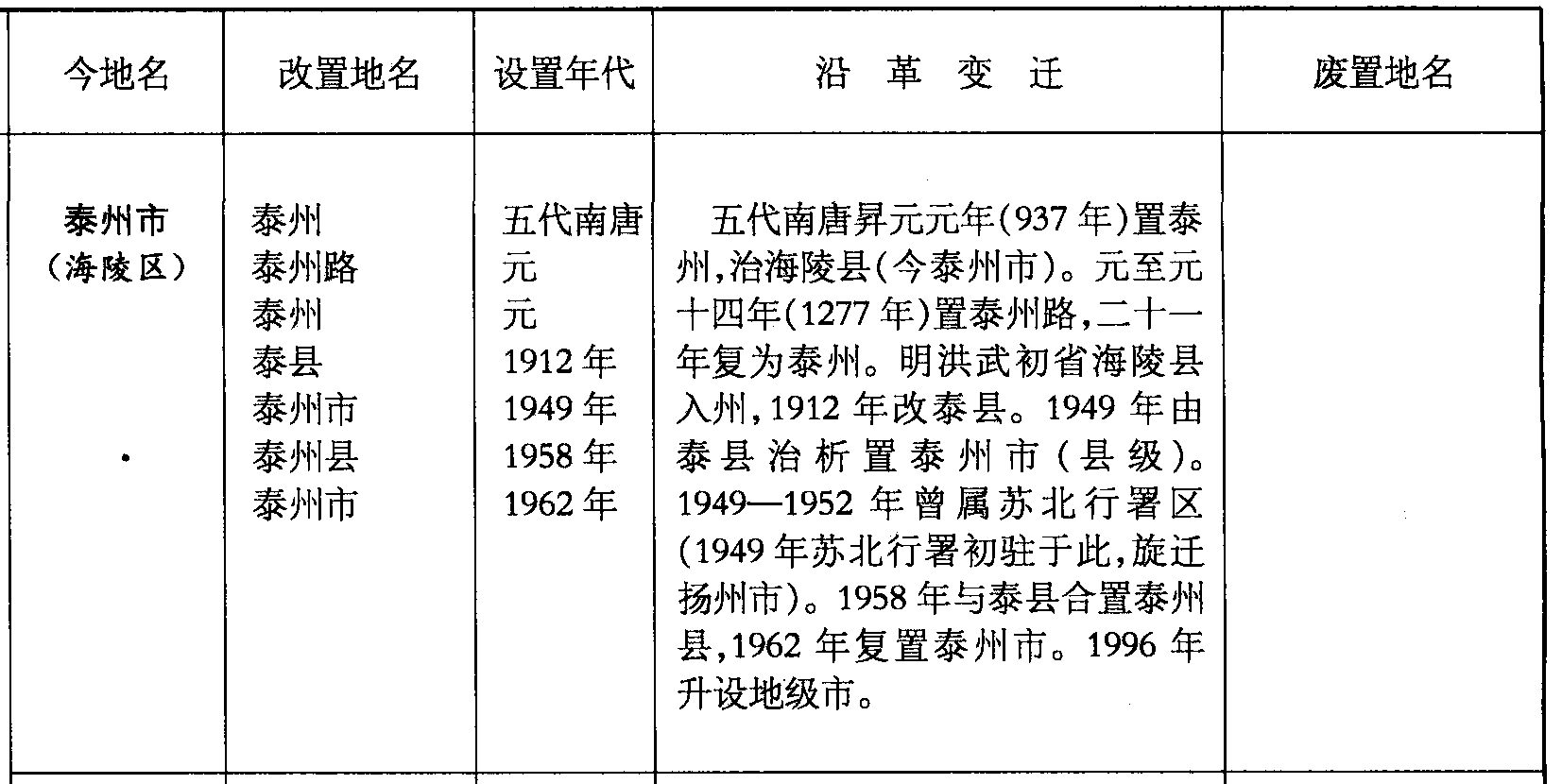泰州市(海陵区)泰州泰州路泰州泰县泰州市泰州县泰州市五代南唐元元1912年1949年1958年1962年五代南唐昇元元年(937年)置泰州,治海陵县(今泰州市)。元至元十四年(1277年)置泰州路,二十一年复为泰州。明洪武初省海陵县入州,1912年改泰县。1949年由泰县治析置泰州市(县级)。1949—1952年曾属苏北行署区(1949年苏北行署初驻于此,旋迁扬州市)。1958年与泰县合置泰州县,1962年复置泰州市。1996年升设地级市。