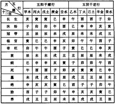 阴阳五行家术语。又称“五行寄生十二宫”、“长生五行”。指五行在1年12个月中从怀胎、出生、成长到死亡的过程,分为12个阶段。按《三命通会》卷2《论五行旺相休囚死并寄生十二宫》的说法,十二宫的名称为:绝、胎、养、长生、沐浴、冠带、临官、帝旺、衰、病、死、墓。其具体含义分别见各条。现按夏历将五行寄生十二宫列表如下:  五行十二宫的规律为:阳干顺行,阴干逆行。具体表现为:阳之所生,即阴之所死;阴之所生,即阳之所死。《三命通会》云:“凡推造化,见生旺者未必便作吉论,见休囚死绝未必便作凶言。如生旺太过,宜乎制伏;死绝不及,宜乎生扶。妙在识其通变。古以胎、生、旺、库为‘四贵’,死、绝、病、败为‘四忌’,余为‘四平’,亦大概言之。”关于阳干、阴干,参见干支部分“阳干”、“阴干”条。 |