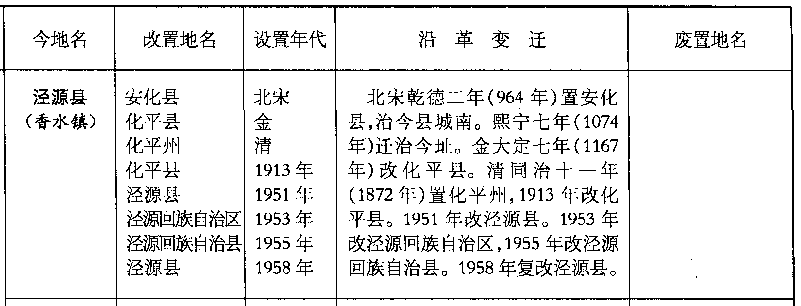 泾源县(香水镇)安化县化平县化平州化平县泾源县泾源回族自治区泾源回族自治县泾源县北宋金清1913年1951年1953年1955年1958年北宋乾德二年(964年)置安化县,治今县城南。熙宁七年(1074年)迁治今址。金大定七年(1167年)改化平县。清同治十一年(1872年)置化平州,1913年改化平县。1951年改泾源县。1953年改泾源回族自治区,1955年改泾源回族自治县。1958年复改泾源县。