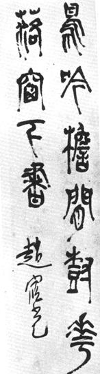 【赏析】: 有明一代,帖学盛行,行草书的成就最爲突出,以篆隷名家者就极少了。由于赵宧光一生致力古文字学,所以他的篆书能够多取得一定的成就,而且工于篆刻。他同妻子一起隐居在寒山,足不至城市,可见人品已非同流俗。他的篆书也不蹑遗迹,而独具一格。前人说他“创作草篆,盖原《天玺碑》而小变焉”,是说得不够全面的。赵宧光精于字学,所见金文、碑刻则不在少数。他是在理解和掌握古人篆书的结字用笔以后,师其意而变其形,师其笔而捨其刀,摆脱“玉筋篆”圆转匀细的笔画,而代之以较爲自由变化的草书笔画,纵情写出自家的“草篆”来的。名爲“草篆”,实际上是一种篆书的“行体”写法。从他传世的篆书看,有的似出自《天玺碑》,有的则不然。这条篆书五言二句轴就有汉碑额的笔意而加以放纵,和后世出土的汉《袁安碑》颇爲暗合,足见他对古法有独到的理解。“檐、落、窗”等字写得拙中藏巧,质朴自然。但从整体上看,写得过于随便,气势不够连贯。首行的“树、花”二字,字距松散,而且“树、下”二字的重心不稳,是其不足之处。因此,这条篆书轴不是他的精品。 赵宧光创爲草篆,曾爲人所讥,如从简牍篆书加以印证的话,就觉得他的写法是有道理的了。赵宧光的“草篆”对后世篆书的发展起著一定的啓迪作用,应该说他是一位富于创造性的书法家。 |