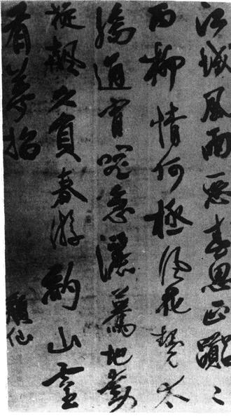 【简介】: 明·徐霖书。绢本。行书,凡五行,共四十二字,198.6×106.2cm。南京博物馆藏。刊于日本《中国书道全集》(七)。 【赏析】: 看徐霖的这幅《五言诗轴》,简直有一种诗书交融的美感。  雨柳风花,大有“风流总被风吹雨打去”的况味。主人情思恹恹,春游入梦,也自然是这时的心情了。 而配合这一环境和情緖上的破坏之中的完美,在诗轴落笔上,也破而有完美,狼藉而有法度。加之笔致润燥相杂,完中有破,从而在气氛上作了破坏性的渲染。然而使人感到惊异的是,就在这种雨骤风狂的破坏性的渲染中,给人提供的竟是一种这么淋漓尽致,这么痛快怡人的感觉,这是不能不使人深深叹服而又要作一番追根刨底的咀嚼的。 原来,破而愈完,坏而返美的关键,还在于作者巧妙地利用了冲突中求统一的辩证法则。如果一味的破,一味的坏,矛盾彻底倒向了一边,那就无从对比,无从显示了。这裏,作者的分寸是破三完七,比如诗轴枯破之笔,虽时时显现,然而在总量上却敌不过完笔的佔有绝对优势。又如尽管在行笔落墨的布局上作尽情的挥洒,但通篇的结构却又显得那么的完整严谨而无懈可击。 製造矛盾,製造冲突,製造险象,然后却又破除矛盾,破除冲突,破除险象,看来,这就是徐霖作书的杀手锏了。 |