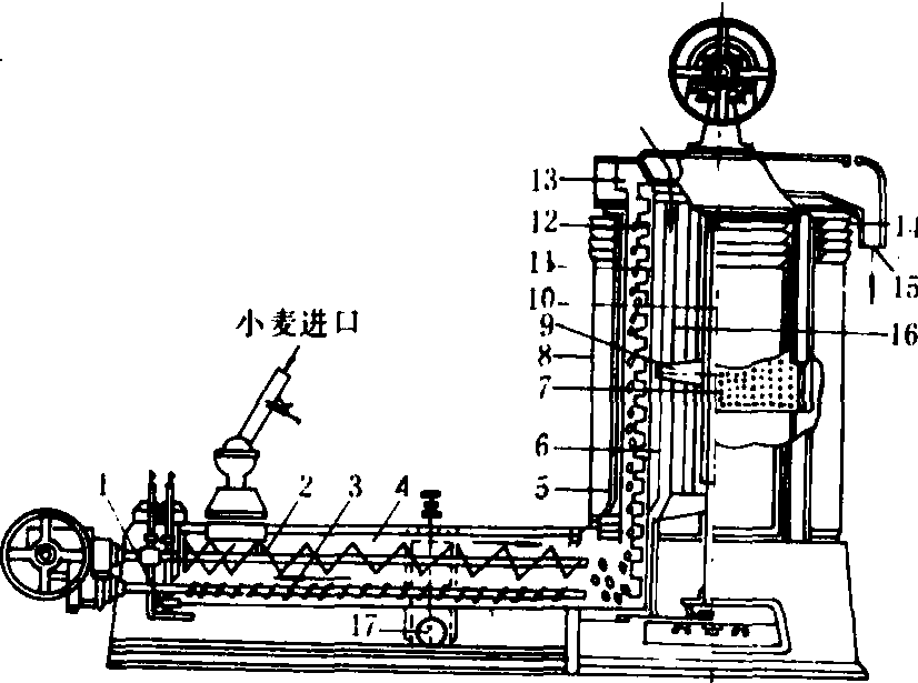 洗麦机结构及工作示意图 1.石子收集斗; 2.甩干机; 3.砂石螺旋输送器; 4.洗麦槽; 5.小麦螺旋输送器; 6.甩板圆筒; 7.筛面圆筒;8.外壳; 9.支架; 10.主轴; 11.角铁; 12.甩板; 13.刮板; 14.排气孔; 15.出麦口; 16.铁板; 17.排水孔 在洗麦槽内装有两对水平螺旋输送器,上面的一对小麦螺旋输送器,从左向右运送小麦,下面的一对砂石螺旋输送器,从右向左运送砂石。由于桨叶式叶片的旋转,搅动洗麦槽中的水,小麦进入水槽中后不能及时下沉而呈悬浮状态,被推送进入甩干机的底部。但砂石等重物则在水中很快下沉,被砂石螺旋输送器的螺旋叶片推向相反方向,掉入砂石收集斗。小麦与砂石的分离程度,主要取决于桨式叶片的转速和水位高低。 甩干机由甩板叶轮、筛面圆筒和金属外壳组成。筛面圆筒固定,下部为长形筛孔,起滤水作用,筛孔尺寸一般为1.5×(17~20)毫米,横向排列;上部为鱼麟形筛孔,起甩干作用,筛孔尺寸一般为1.3×15毫米,竖直排列。甩板叶轮是由固定在垂直轴上的支架、垂直角铁及倾斜的甩板组成。甩板按一定的距离装在角铁上呈螺旋线形,并与水平成32°~45°角,便于把小麦向上推送。叶轮内部装有风扇叶片,旋转时将空气由里向外排出。为了防止甩干机筛孔被随水甩出的麦皮、泥土等杂质堵塞,在筛面圆筒外面,还装有冲孔的环形水管。 工作中,从洗麦槽进入甩干机底部的小麦,由于甩板叶轮的旋转,甩板不断将小麦由下向上推动,并在离心力作用下将麦粒表面上附着的水从鱼鳞筛孔中甩出去。当小麦推送到顶部附近时,被安装在甩板叶轮上部的刮板送至出料口。风扇叶片将空气带着水珠与湿气,从鱼鳞筛孔排出,起吹干麦粒和吹穿筛孔的作用。 洗麦机wheat washer用于制粉前清洗小麦表面泥灰和其他污染物的设备。主要工作部件为洗麦槽、甩板圆筒、鱼鳞筛筒、环形喷水管等。工作时,小麦由下部的进料管进入洗麦槽,由于甩板筒旋转将小麦清洗并向上推送,同时又甩到鱼鳞筛筒内壁,把小麦表面的污物和水分分离出去,干净的小麦自顶部出料口排出,杂质和污水穿过鱼鳞筛孔汇合到底部,由出水口排出;上部的环形喷水管定时、自动地对鱼鳞筛筒喷水,以清除筛筒表面的污物。 |