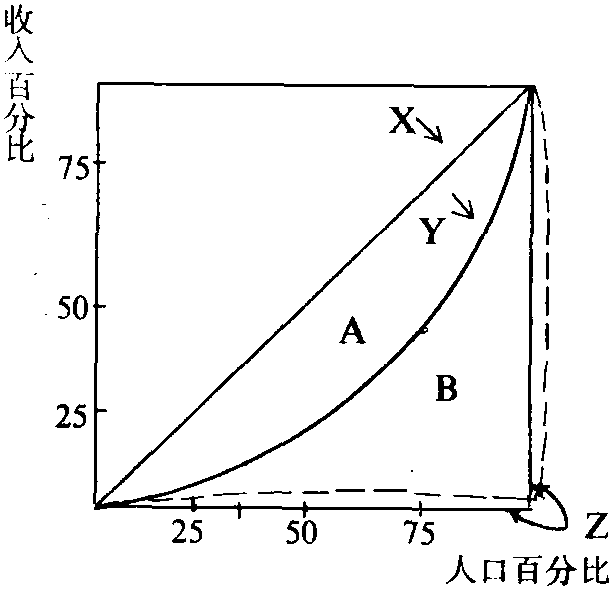 纵轴代表收入百分比,横轴表示人口百分比,X线是绝对平均分配曲线,人口的百分比与收入的百分比完全对称;Y线是具有一定程度不平均的分配曲线;Z线是绝对不平均分配曲线,只有在一个人占有收入的百分之一百,其余人占有收入为零时才会出现。根据洛伦茨曲线,可得基尼系数。A表示实际分配曲线与绝对平均分配曲线之间的面积,B表示实际分配曲线与绝对不平均分配曲线之间的面积,基尼系数的计算公式为