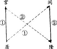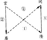 表示双声,虚线表示叠韵; 第三组:正到双声、傍到双声、正叠重道、傍叠重道。这四个术语还可以分两部分,第一部分是正到双声和傍到双声。 正到、傍到的“到”,是颠倒的意思。这两个术语是就上边正双声、傍双声说的,正双声、傍双声两组字交叉颠倒每组字的前后次序,就得到正到双声、傍到双声。 如《宫》图标明:居宫——正到双声,闾隆——傍到双声。所谓正到双声的居宫,恰好就是傍双声宫居二字次序的颠倒,傍到双声的闾隆,恰好就是正双声隆闾二字次序的颠倒。 第二部分是正叠重道和傍叠重道。正叠就是上文的正叠韵,傍叠就是傍叠韵。 “重”是重复的意思,“重道”意为再重复说一遍。这两个术语纯粹是为了与正到双声和傍到双声对应、使图面整齐而虚设的,术语本身和它的例字都表明是把正叠韵与傍叠韵再说一遍。如《宫》图标明:居闾——正叠重道,宫隆——傍叠重道。实际上居闾正是上文的正叠韵,宫隆正是上文的傍叠韵。 第三组术语也可以用下面的简图来表示(图例同上):