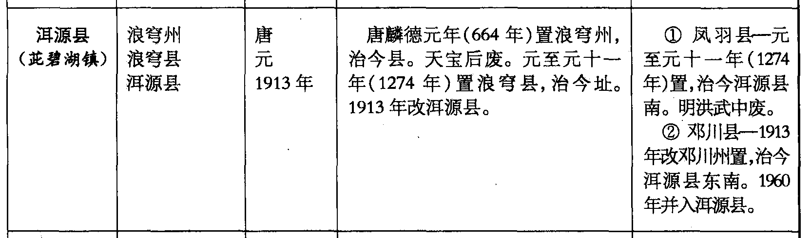洱源县(茈碧湖镇)浪穹州浪穹县洱源县唐元1913年唐麟德元年(664年)置浪穹州,治今县。天宝后废。元至元十一年(1274年)置浪穹县,治今址。1913年改洱源县。❶ 凤羽县—元至元十一年(1274年)置,治今洱源县南。明洪武中废。❷邓川县—1913年改邓川州置,治今洱源县东南。1960年并入洱源县。