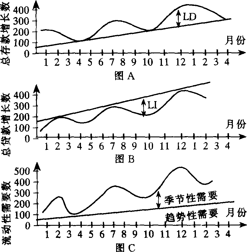 图中 (A) 表示在季节性存款变动中可通过连接各个波谷的低点连成一条趋势线,LD表示季节性流动性需要。在图中(B) 连接季节性贷款变动曲线的波峰得到一条趋势线,LI表示季节性流动需求。在图中 (C) 表示季节性和趋势线两种流动性需要综合起来的轨迹。其趋势性流动性需要的计算由贷款趋势变化减去存款趋势变化得出。差为正,是流动性要求; 差为负是流动性剩余,其季节性流动性需要的计算由贷款和存款二者的季节性,性需要相加之和得出。 在流动性需要具体计算时,还要将随着存款增减而引起法定准备金升降因素考虑进去,可按下列公式测算: