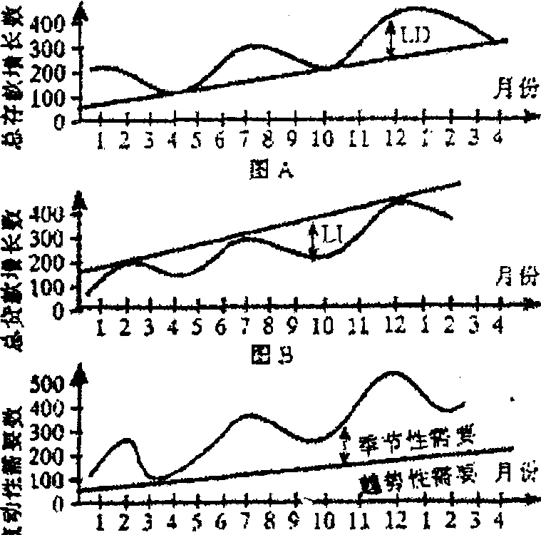 图4-6 图4-6(A)表示在季节性存款变动中可通过连接各个波谷的低点连成一条趋势线,LD表示季节性流动性需要。在图4-6(B)中连接季节性贷款变动曲线的波峰得到一条趋势线,LI表示季节性流动需求。在图4-6(C)表示季节性和趋势线两种流动性需要综合起来的轨迹。其趋势性流动性需要的计算由贷款趋势变化减去存款趋势变化得出。差为正,是流动性要求;差为负是流动性剩余,其季节性流动性需要的计算由贷款和存款二者的季节性,性需要相加之和得出。 在流动性需要具体计算时,还要将随着存款增减而引起法定准备金升降因素考虑进去,可按下列公式测算: