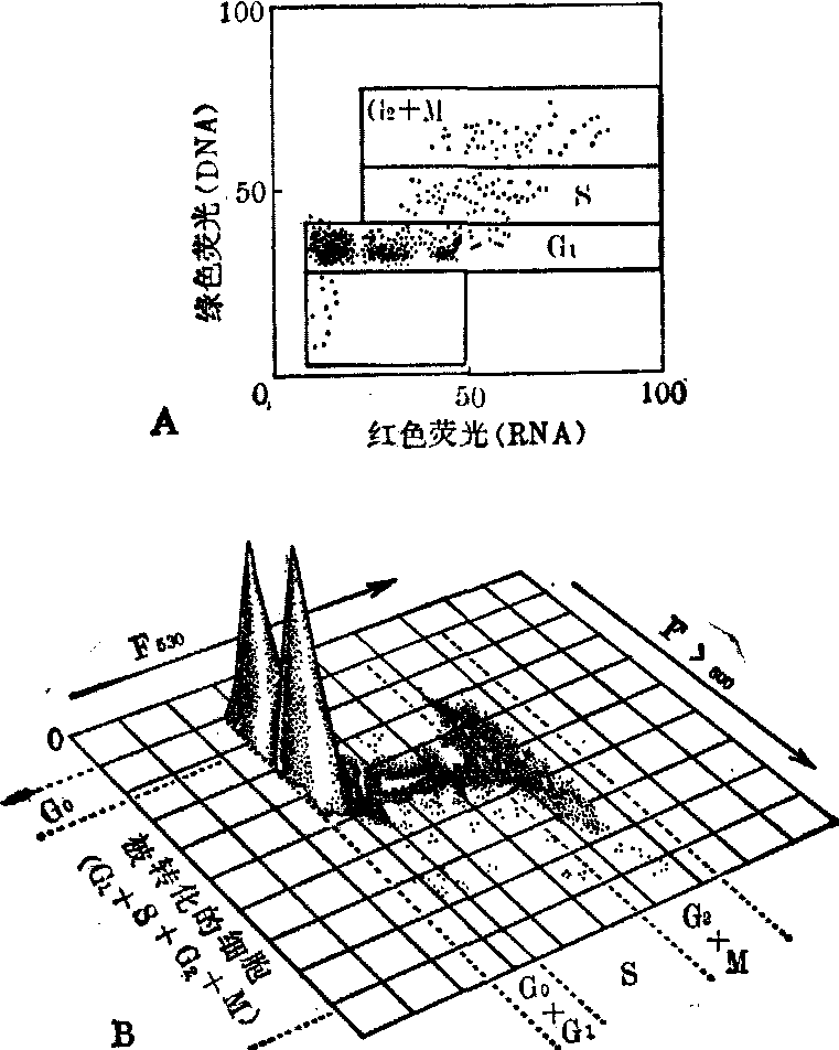图1 流式细胞光度计和分类计 细菌等) 经荧光染料染色后制成样品悬液,在一定的压力下通过鞘流包围的进样管进入流动室,悬浮细胞排成单列流经检测区与激光束相交,被激发产生荧光。与入射光束成90。放置的光学系统收集荧光信号。图1中的阻断滤色片用于阻挡激发光,二色分光镜及另一些阻断滤片用于选择荧光波长。检测器一般使用光电倍增管。光散射收集器测量细胞的小角度前向散射,以测定细胞的大小。细胞分类器工作原理是由超声换能器产生高频振荡以振动液流喷嘴,使液流断离成一连串均匀的小液滴,小液滴包含待分类样品(如细胞),液滴刚形成之前,则根据已检测的细胞不同性质给液滴充以正或负电荷,带电的液滴通过静电场时,发生向左或右偏转,从而完成纯细胞的分离,供专门的化学和生物学研究。 整个仪器用多道脉冲高度分析器处理荧光脉冲信号和光散射信号,测量结果以频率分布图显示出来。目前荧光测定灵敏度较高,每个细胞只要有几百个荧光素分子就能被检测出来。用狭缝扫描技术进行检测,直径50μm的样品流可达到5μm的分辨率。 流式细胞光度计已用于生物学和医学研究的几个方面,主要有: (1) 细胞生物学研究: 用于测定细胞周期各时相细胞的百分比。通过测定细胞群体中每个细胞的DNA含量,得出DNA含量的分布图(图2)。 图2中第一个峰是含有2C DNA含量的G1/G0(DNA合成前期/静止期)细胞,其次一个峰是4C DNA含量的G2+M(DNA合成后期 + 有丝分裂期)细胞,从2C到4C间的区域为S期 (DNA合成期)细胞。采用绘图法或最小平方拟合法可计算出细胞周期中各时相的细胞占整个细胞群体的百分数。 双参数分析是对同一个细胞测定它的二种性质,如散射光和荧光,或二种不同颜色的荧光。经吖啶橙染色的细胞,其DNA发绿色荧光,RNA发红色荧光。这样能同时测定一个细胞内的DNA和RNA含量。测定结果可用二维散布点图或等量图 (Isometric display)表示(图3)。用这种方法可鉴别出G0期与G1期,M期和G2期细胞。
