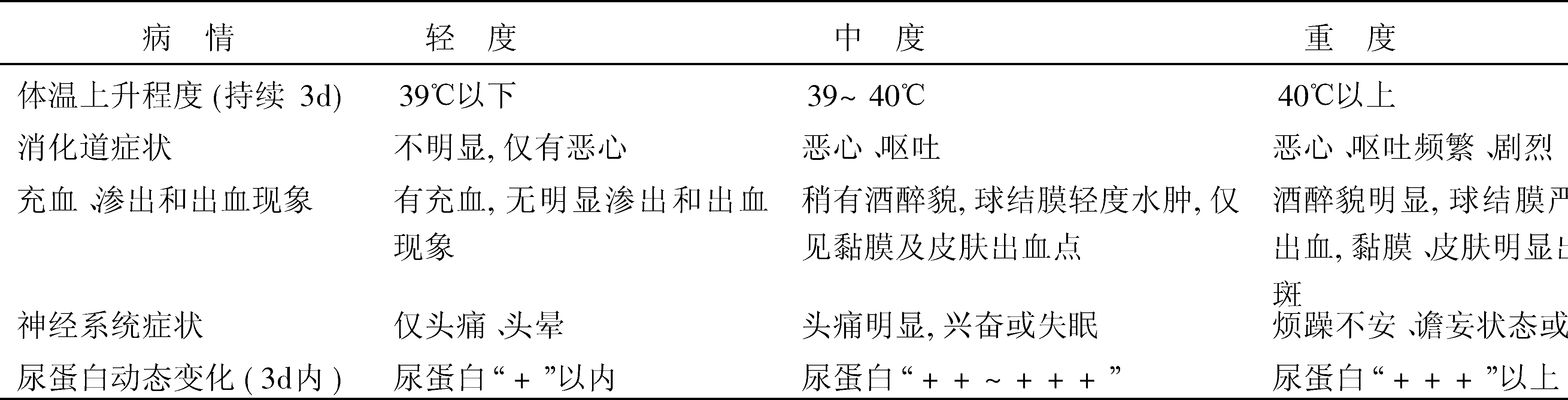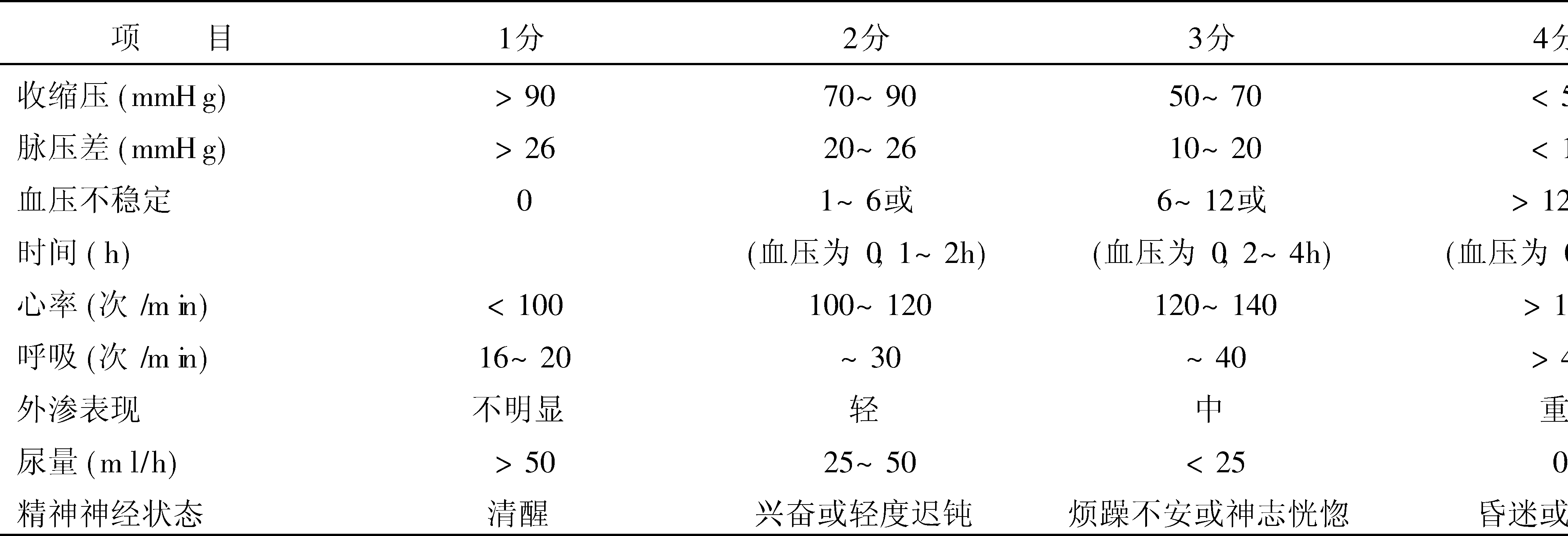 注:对某一时间(低血压或休克出现后4h或8h)内的临床表现,以最坏情况时的资料记分;如有几次血压则取最低值,而心率则取最高值,有严重心律失常或心力衰竭者记4分;呼吸衰竭记4分;外渗表现;球结膜轻度水肿属“轻”;球结膜明显水肿,眼脸浮肿属“中”;颜面或全身浮肿,或有胸水、腹水或球结膜高度水肿属“重”。