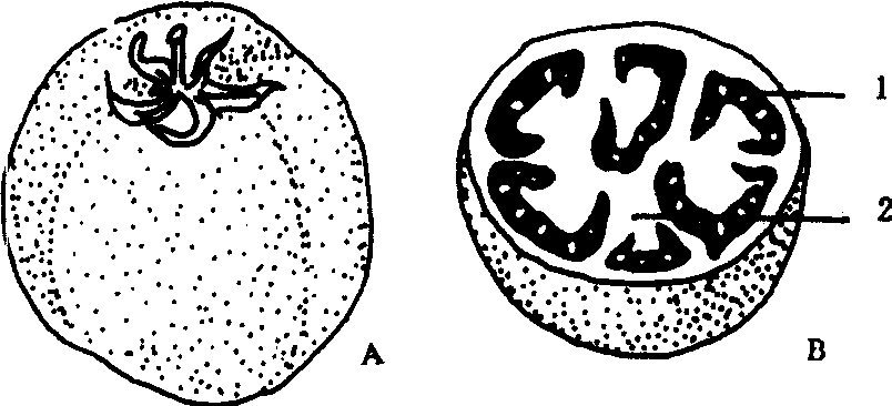 图 1 葡萄果粒的内部构造 左. 纵切面; 右. 横切面 1. 柱头底; 2. 果心维管束; 3. 维管束环4. 果心; 5. 种子; 6. 果蒂 葡萄的果实构造(图1)。果皮最外是一层表皮细胞,致密而光滑, 上覆蜡质果粉。表皮下8~10层壁较厚的细胞,幼果时含叶绿体, 成熟时褪绿; 有色品种含花青素, 呈现黄、红、紫、黑等不同色彩。在有香气的果实中, 外果皮还含有芳香物质, 不同种和品种香型不同, 如欧亚种的许多栽培品种为玫瑰香型, 美洲种多为草莓香型。中果皮与内果皮形成柔软多汁的果肉, 仅由维管束环将其分为内外两层。最内层是内表皮细胞。果肉中有无色素,依品种而异, 如玫瑰香、黑罕、巨峰、佳利酿等品种, 果肉无色素, 果汁白色;紫北塞、黑赛比尔等品种及河岸葡萄、燕垒、山葡萄, 果皮和果肉都有色素, 果汁红色。内表皮以内为心室, 由2个心皮构成, 每室2个胚珠, 形成1~2粒种子, 个别品种无籽。种子与果肉分离的难易, 因种而异, 美洲种有肉囊, 不易分离; 欧亚种无肉囊, 易分离。果粒与果柄相接膨大处, 称果蒂。果柄内部有维管束直达果顶, 并有分支与果肉及种子相连, 去粒后仍留在果柄上, 称果刷。不同品种果蒂、果刷有一定差异。 猕猴桃的果实构造(图2、3)。外表皮多为褐色,由一层木栓化细胞形成, 皮孔和表皮有毛或无, 因种而异。中华猕猴桃, 表皮常具单细胞毛、单列多细胞毛和多列多细胞毛。果皮下的果肉组织, 由圆或近圆形的薄壁细胞组成, 大小不一,直径20~200微米。果心中央有一果心轴, 由小型的长圆形薄壁细胞组成。整个果肉遍布许多大型异细胞,为分泌组织, 内含粘液。每室含多数胚珠, 形成许多小型棕色种子。种子纵扁椭圆形,种皮有网纹,由一层被角质的木栓化细胞组成。胚小, 胚乳发达, 由6层以上多角形无间隙的薄壁细胞组成, 内含大量淀粉。