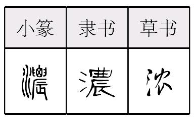 *浓(濃)nóng9画 水部 (1) 厚;密;多: ~枝|~霜|~密。 (2) 液体、气体中含某种成分多: ~郁|~度|~茶|~烟。 (3) 颜色重: ~绿|~妆|~艳。 (4) 程度深: 睡意正~|兴趣~厚|~~的亲情。 浓濃nóng古代形声字。从氵(水),农(農)声。本露水多状。引申为含某种成分多。如:浓茶|浓烟。又引申为深厚,不淡薄。如:兴趣正浓。组词如:浓厚。 浓濃★繁◎常★常