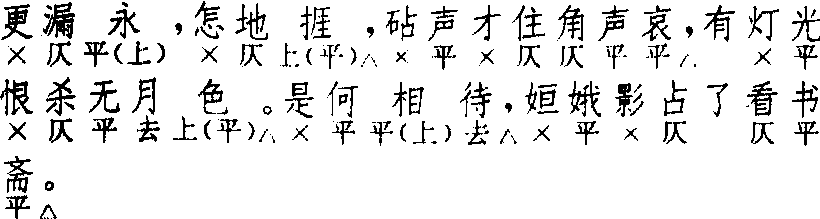 △。《北曲新谱》谓:“此章与〔醋葫芦〕全同,惟板式不同,观《广正》可知。此外则〔醋葫芦〕可连用十馀支,〔浪来里〕只可一支或两支,如用两支,且须隔开。〔浪来里〕可作尾声用,〔醋葫芦〕则不能。凡此均可证明二者实非一调,故《正音》、《广正》皆两收之。”一作〔浪里来〕。《太和正音谱》注:“亦作煞。”煞即尾声。作尾声用时,则题〔浪来里煞〕或〔浪里来煞〕,此为〔商调〕最常用之尾声。尾声第四句本七字,常有摊破。如无名氏《罗李郎》“我拼的撅皇城,挝怨鼓,插状子”,破为三字三句;李爱山“牡丹亭”套“还不彻相思债,叫不应离恨天”,破为五字二句。这两种变式皆合于北曲句式变化通例。
