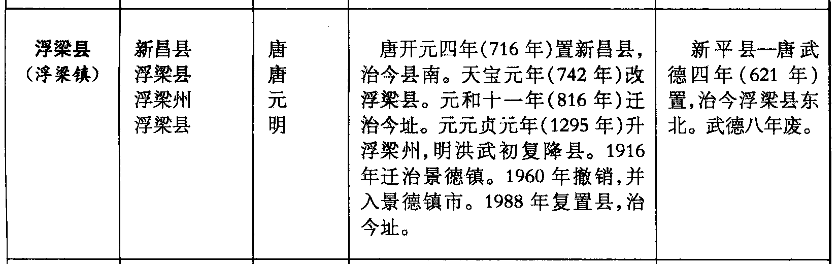 浮梁县(浮梁镇)新昌县浮梁县浮梁州浮梁县唐唐元明唐开元四年(716年)置新昌县,治今县南。天宝元年(742年)改浮梁县。元和十一年(816年)迁治今址。元元贞元年(1295年)升浮梁州,明洪武初复降县。1916年迁治景德镇。1960年撤销,并入景德镇市。1988年复置县,治今址。新平县—唐武德四年(621年)置,治今浮梁县东北。武德八年废。