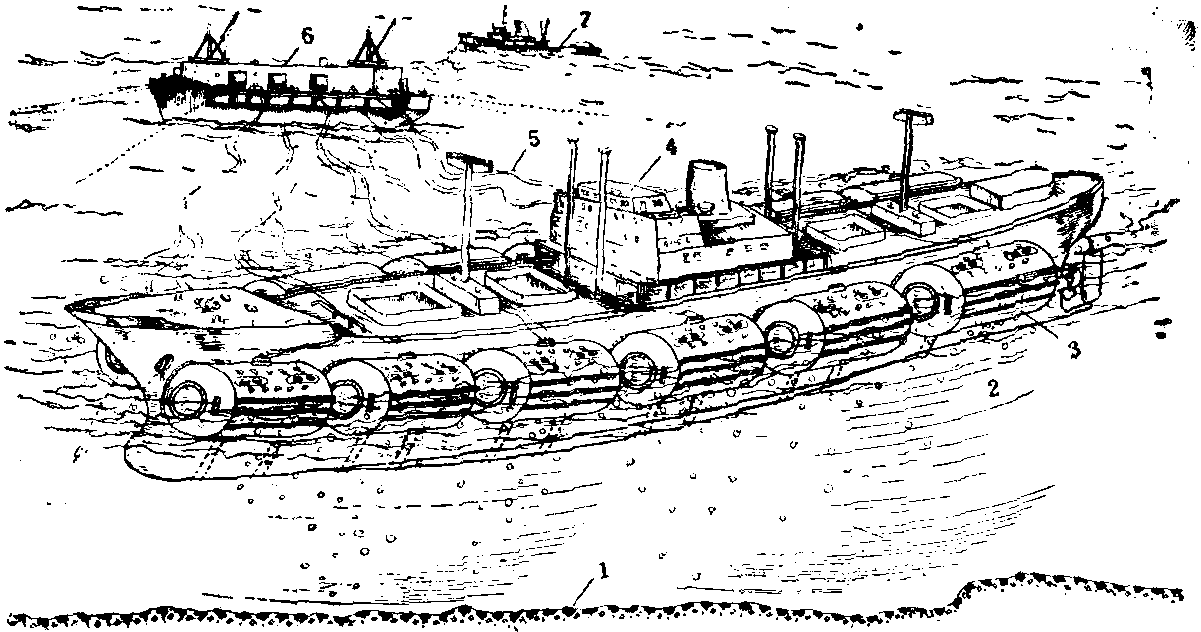 1-沉船浮离的江(海)底;2-浮筒千斤;3-打捞浮筒; 4-沉船;5-浮筒充气管;6-打捞工程船;7-拖船