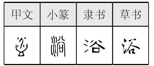 yù初为表意,甲骨文从人从皿,人旁有水点,象人在器皿中洗浴之形;小篆改为形声,从水,谷声,隶定为“浴”。洗澡。 【辨析】 浴/沐/洗 见442页“洗”。浴 甲 篆 隶yù【析形】甲骨文字形是会意字,像人在盘中洗浴,人旁有水滴溅出。小篆字形改作形声字,从水,谷声。 【释义】《说文》:“洒身也。”本义是洗身,洗澡。古文字沐、浴义别。沐指洗头,浴谓洗身。今沐、浴常连称,泛指洗澡。引申指沉浸,浸染。[澡身浴德]澡身:澡洁其身;浴德:沐浴于德。谓修养身心,使之高洁。 【shape analysis】It is the associative character.In Oracle it looks like a person washing in the plate. Beside the person, the water is dripping. In Small Seal script it is changed into the pictophonetic character. The meaning is related to水(shuǐ,water) . It sounds like 谷(gǔ). 【original meaning】 Having s shower. |