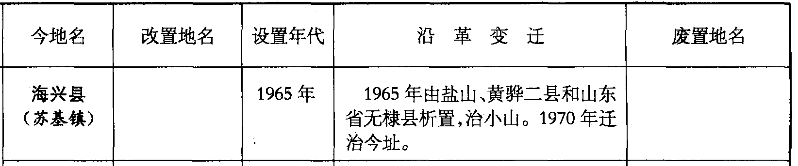 海兴县(苏基镇)1965年1965年由盐山、黄骅二县和山东省无棣县析置,治小山。1970年迁治今址。