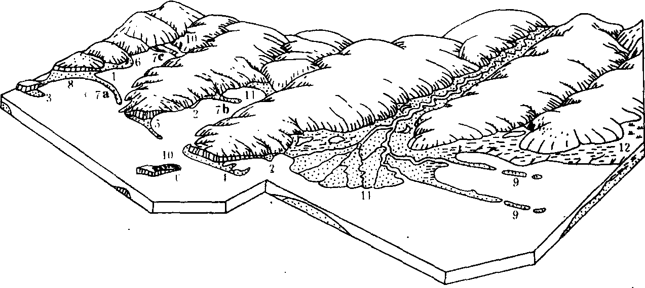 图2 海岸堆积地貌图示 1,海滩2,角滩3,沙嘴4,翼状沙嘴5,箭状沙嘴6,环状沙坝7,拦湾坝(7a湾口坝、7b湾中坝、7c湾内坝) 8,连岛坝 9,离岸堤10,泻湖11,三角洲12,泥滩 进入海岸带的松散物质,在波浪、海流和潮汐的推动下进行运动,并在一定条件下堆积起来,形成各种海积地貌(图2)。海岸带的泥沙、砾石在岸边堆积成为向海缓倾的滩地,称为海滩。根据其物质组成可分为砾石滩、沙滩和泥滩。根据海滩的形态又可分为堤式海滩和斜坡式海滩。海滩大规模的发育扩展,相邻海滩连接成片,成为广阔而平坦的海积平原。有些滨海平原可能蕴藏丰富的滨岸砂矿或石油、天然气等。叠置在海滩上,与海岸大体平行的长堤状堆积体,称为滨岸堤。朝海一面和缓,朝陆一面堤坡较陡,常有几条沿岸平行分布。按其物质组成分为砂堤、砾堤和贝壳堤。堤顶高度相当于形成时的最大风浪高度,研究滨岸堤的高度变化可以反映海平面的升降变化。由波浪激浪流堆积作用形成的,在岸边海中的长条形坝状堆积体,称为沙坝。沙坝顶部一般露出海面,由沙和砾石组成,常含有较多的贝壳碎片。沙坝一般可高出海面几米,宽达几百米,长达几公里或更长。由于沙坝在海岸不同的位置上堆积,其形态不同,名称各异,如图2所示。由波浪和激浪流堆积在离岸一定距离,并出露海面的沙坝,称为离岸坝(又称岸外坝);在岬角和河口处,受沿岸流的作用形成的沙坝,一端与陆地相连,另一端向海伸展,称为沙嘴;沙嘴不断向前伸展,形成拦湾坝;拦湾沙坝把海洋部分隔开,成为与海分离的浅湖,叫泻湖。有的泻湖仍有水道与海相通,有的泻湖与海完全隔离,湖水可能变为淡水。沿岸海流形成的沙坝将岸外岛屿与陆地连接起来,称为连岛坝。河流带来的大量泥沙在入海口处堆积形成三角洲。在平静海湾中,海水流动缓慢,使大量细粒物质,如粘土、生物碎屑等沉积形成泥滩。 ☚ 海蚀作用 海底地貌 ☛ 海岸地貌海岸呈现平直弯曲、高低起伏,平缓陡峭等地表面状态。它是由波浪、潮汐、近岸流等海洋水动力,河流、风和生物以及地壳运动等因素作用下形成的地貌。包括:岩石海岸陡坡处的海蚀地貌;海岸沉积物堆积的砾石海滩、砂质海滩、泥质海滩等;以珊瑚为主的造礁生物形成的岸礁、堡礁、环礁等。海岸地貌复杂多样,依其邻接的内陆地貌、岸滩、近海岛屿等条件,对军事活动有不同程度的影响。 海岸地貌 海岸地貌壮族地区面临北部湾,有防城、北海、钦州、企沙、珍珠等天然良港。海上岛屿众多,海岸类型多样。南流江口和钦江口为三角洲型海岸,洲岛众多,水下沙洲发育;铁山港、大风江口、茅岭江口和防城河口为溺谷海岸,海水深入谷地几十公里;钦州、防城两县沿海主要为山地型海岸,海岸线特别曲折,沿岸多暗礁和岛屿;北海市和合浦县营盘一带为台地型海岸,海岸线比较平直。沿海滩涂面积约7.5万公顷,海底平坦,海水较浅,一般水深20至35米,鱼贝类丰富,为发展海产品生产的有利场所。 ☚ 岩溶地貌 植被 ☛ |