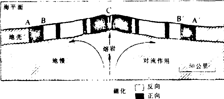 | 释义 | 海底扩张说又称“洋底扩张”。主张海底在不断向两侧扩张的学说。它认为大洋中脊顶部是地幔物质上升并形成新的大洋岩石圈的地方。地幔物质的不断补充和涌升,推动着先形成的大洋岩石圈不断在大洋中脊处向两侧扩张,海底扩张的速度约为1~10cm/a。海底处在不断的运动和更新之中。在太平洋,扩张的洋底与大陆边缘相碰撞,并沿海沟向下俯冲,重新返回到地幔中,这样不到2亿年大洋底即可更新一次。海底洋壳从生成到消亡,是随时更新的,其年龄不会老于晚三叠纪或侏罗纪(即不会超过227~205Ma)。1960~1962年,美国H.H.赫斯和R.S.迪茨先后提出海底扩张说。1963年,F.J.瓦因和D.H.马修斯提出海底条带状磁异常模式,为海底扩张提供了重要证据。深海钻探计划执行的巨大成就也给它以有力的支持。20世纪70年代以来,海底扩张说得到广泛认可。它的确立,使大陆漂移说死而复生,为板块构造说奠定了坚实的基础。 海底扩张说 海底扩张说haidi kuozhangshuo海底地壳生长和运动扩张的一种学说,是对大陆漂移说的进一步发展,也是板块构造学说所以产生的重要基础。长期以来,人们把精力主要集中在对大陆壳的研究,而对占有地球表面2/3以上的洋底,由于缺少必要的研究手段而被忽略了。50年代以来,在古地磁学、地震学、地热学、重力学、火山学、海底地貌、海洋探测技术、海底打捞技术、电子计算技术、人造卫星遥测技术等方面取得很大进展,因此产生了一门新的科学即海底科学。由于海底科学的发展,发现了一系列令人信服的使大陆漂移说复活的资料和数据。其中之一是发现海底地磁异常带呈对称分布的现象(图1),是一幅由航空磁测而成的冰岛南大西洋中脊——雷克雅奈斯海岭两侧地磁异常分布图,在海岭两侧黑白条带是对称分布的,黑条带代表正极性方向,白条带代表负极性方向(目前已知地球在地质时代磁极曾多次南北易位,这种现象叫地磁倒转。古地磁研究发现有的岩石磁化方向与现在地球磁场方向一致,叫做正极性方向;有的则正相反,叫做负极性方向)。另外还发现海底岩石年龄及其分布有如下特点,一是在大洋中脊两侧,年龄由新到老呈对称分布;二是最老的岩石年龄只有2亿年,相当中生代侏罗纪。为什么地磁异常带及海底岩石年龄在洋脊两侧呈对称分布?为什么海底岩石年龄如此年轻(大陆最老岩石年龄在30亿年以上)?1960年,美国学者H·H·赫斯对此作出答案:他设想海底不是固定的和永恒不变的(图2),大洋中脊或海岭(C)是地幔物质的涌出口,地下熔融的岩浆通过中脊不断溢出,凝固后形成新的洋壳。由于新的洋壳不断产生和向外扩张,把老的洋壳不断推向两边(如图中AA′、BB′原先是重合在一起的洋脊,现在因海底扩张而被分开),所以越远离洋脊,年龄越老;越靠近洋脊,年龄越轻。同时,从地幔涌上来的熔融物质,随凝固成岩石随受到当时磁场的磁化,因而把地球磁场的倒转史也给记录下来了,乃形成对称分布的地磁异常带。1961年,R·S·迪茨把这一理论命名为“海底扩张说”。洋脊两侧的海底扩张速度,因时因地而不同,每年每边约为1~5厘米。但洋壳水平位移可达数千公里。地表总面积是一个常数,既然有一部分洋壳不断新生和扩张,那就必须有一部分洋壳在逐渐消亡。原来由中脊上升岩浆物质形成的大洋壳,不断推向两边,当其遇到大陆壳时,便向它下边俯冲,逐渐熔化而消亡。这一过程实际上是洋壳“新陈代谢”的过程,其所历时间约需2亿年。这就是为什么在大洋壳中没有发现年龄比这更老的岩石的缘故。