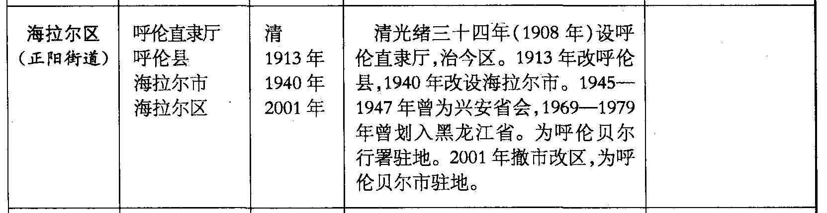 海拉尔区(正阳街道)呼伦直隶厅呼伦县海拉尔市海拉尔区清1913年1940年2001年清光绪三十四年(1908年)设呼伦直隶厅,治今区。1913年改呼伦县,1940年改设海拉尔市。1945—1947年曾为兴安省会,1969—1979年曾划入黑龙江省。为呼伦贝尔行署驻地。2001年撤市改区,为呼伦贝尔市驻地。